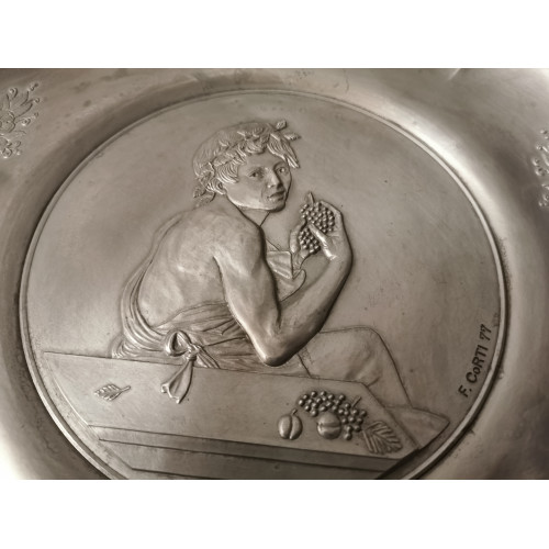 Олов'яна насгїнна тарїлка панно Дївчина з виноградом, художнє лиття, Німеччина, 20 століття, дїаметр 32 см